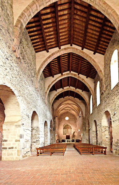 La nef impressionne par ses dimensions : 30,50 m de long sur 9,5 m de large. Elle est bordée de murs bâtis en gros appareil de granit pour les chaînages et en blocs irréguliers pour les murs. La muralité est si importante que l'on soupçonne à peine la présence des collatéraux et du transept. Les murs étaient percés d'arcs outrepassés qui ont été rabotés au XVIème siècle, sauf les deux près du transept. |