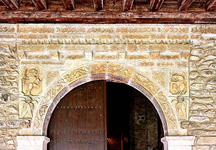 Le dessus de la porte entre le cloître et l'église est constitué de parties de la tribune qui a été démantelée au XVIème siècle. Cette tribune-jubé était installée au milieu de la nef. C'est probablement le même atelier qui sculptera ensuite la tribune de Serrabone. L'arc en plein cintre est composé d'une frise d'animaux fantastiques. Le portail est encadré de deux statues piliers représentant Pierre et Paul.