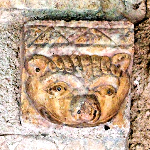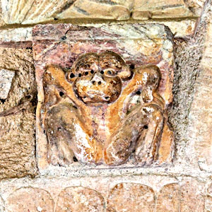 L'ornementation des côtés est complétée par deux modillons représentant un singe à gauche dans une position quasiment obscène (le Malin) et une tête de lion ( ou d'ours ?, autre représentation du malin) à droite. |