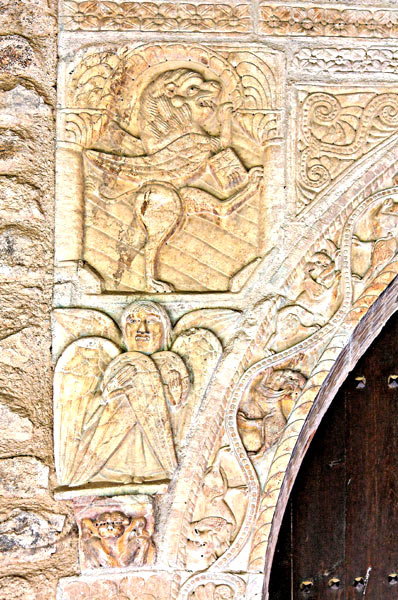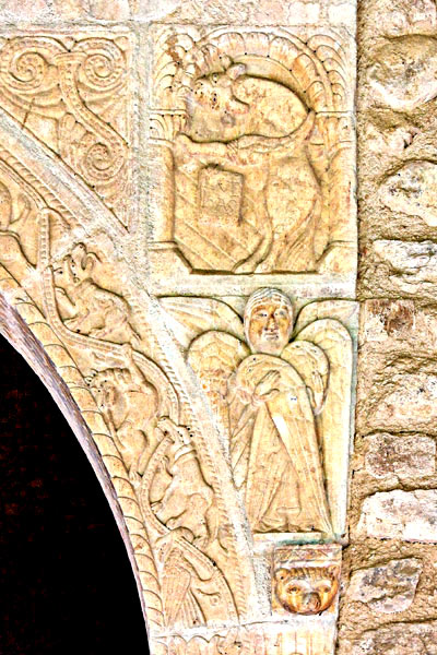 Au dessus, sous des arcs, sont sculptés le lion de Marc à gauche et le taureau de Luc à doite. Le sculpteur a inscrit le même nom "LVCHAS" (Luc) sur les deux livres. Les deux animaux sont taillés en semi-méplat sur un fond strié. Les séraphins ont un relief plus marqué. Tout autour de la porte un bestiaire est sculpté. |