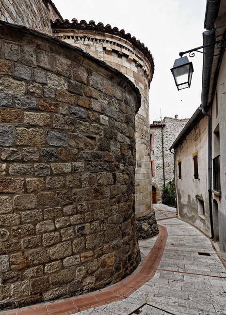 La construction du chevet a bénéficié d'un soin particulier. L'appareil est fait de blocs de granit parfaitement taillés. Un cordon de dents d'engrenage souligne la toiture de l'abside principale.
