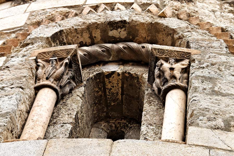 La fenêtre du chevet :elle est ornée de 2 colonnettes comportant des chapiteaux décorés d'oiseau, de figures humaines et de lions. Cette iconographie est issue des ateliers régionaux et dateraient de la fin du XIIème siècle. Un tore orné de rosettes et un cordon de dents d'engrenage soulignent la courbure de la fenêtre.